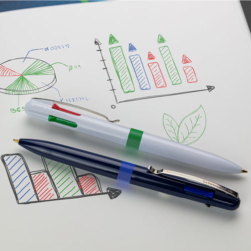 Vierfarb-Kugelschreiber mit den Schreibfarben schwarz, rot, blau und grün. Schneller und komfortabler Farbwechsel durch farbige Schieber. Umwelt- und ressourcenschonend mit einem *Gehäuse aus 92 % Recycling-Kunststoff. Stabiler Metallclip. Mit Viscoglide®-Technologie für außergewöhnlich weiches und gleitendes Schreiben. Strichstärke Medium (M). Alle 4 Schreibfarben sind dokumentenecht nach ISO 12757-2. Nachfüllbar mit Schneider-Mine „Take 4 Refill“.