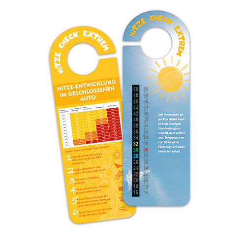 Der Klimawandel ist allgegenwärtig und die globale Erwärmung keine Fiktion mehr. Vorsicht vor zu starker Hitze im Alltag ist geboten. Bei diesem Giveaway mit höchster Werbewirkung und nachhaltiger Nutzungsdauer, handelt es sich um einen Autospiegel-Anhänger als beidseitig bedruckte Werbekarte (Format 72 x 210 mm inkl. Anhängerlasche) mit integriertem Folienthermometer bestehend aus leuchtenden Flüssigkristallen.