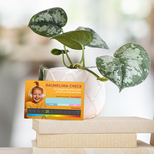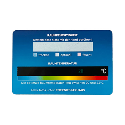 RaumklimaCheck zum Testen der Raumfeuchtigkeit und Raumtemperatur. Diese Karte soll eventuell vorhandene Raumklima Probleme wie zB zu hohe Luftfeuchtigkeit aufdecken. Ab 60% Luftfeuchtigkeit ist ein Raum zu feucht und muss schnellstens gut gelüftet werden. Bei langanhaltenden Feuchtigkeitsproblemen sollten Fachleute zu Rate gezogen werden. Diese RaumklimaCheck Karte wurde entwickelt um eine Sensibilät hierfür zu wecken. Sie ist KEIN geeichtes Messinstrument!