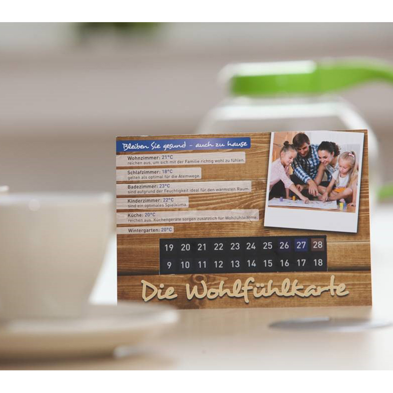 Mit dieser individuell bedruckten Wohlfühlkarte können Sie die Raumtemperaturen in Ihrer Wohnung oder Ihrem Haus testen und ggf. anpassen.