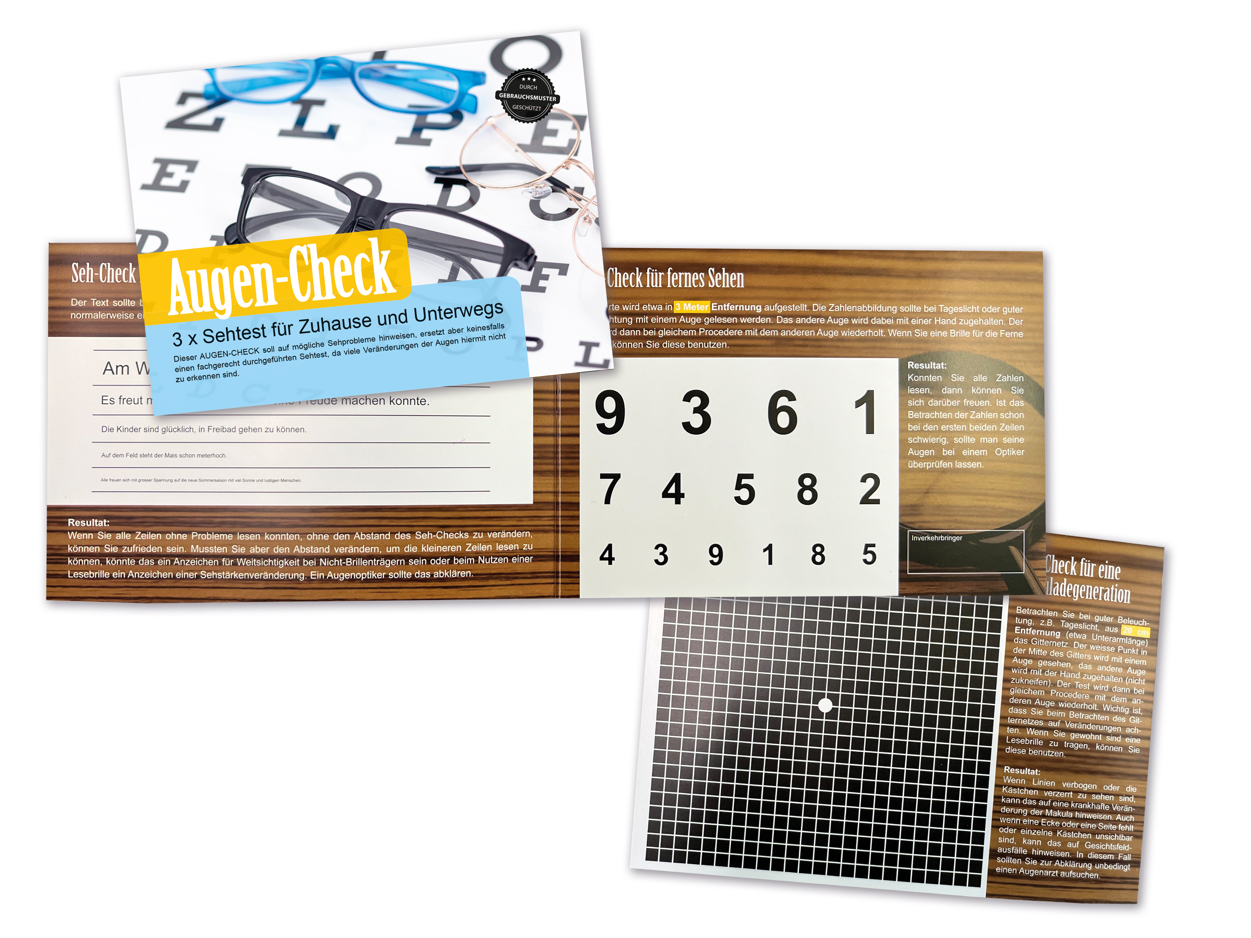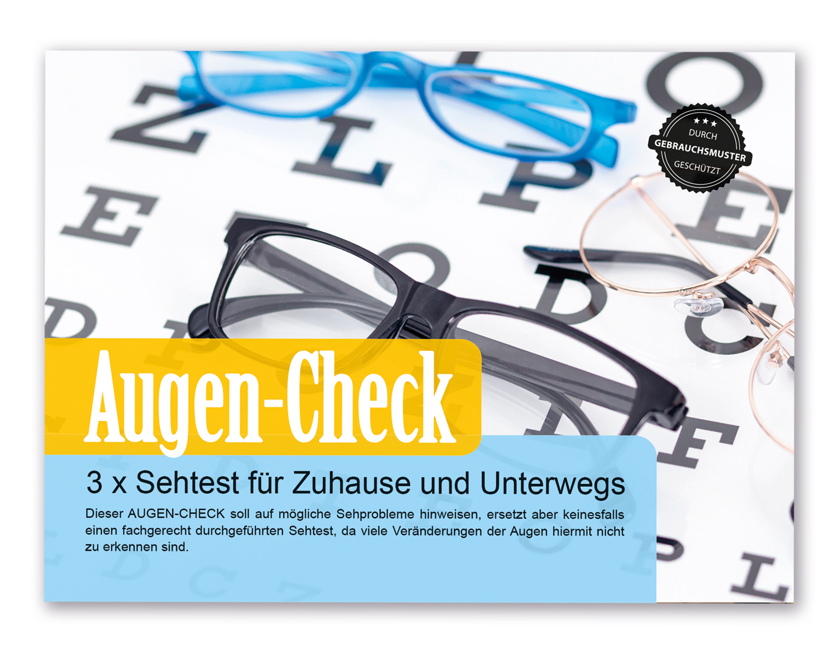 Der AugenCheck ist ein praktischer Schnelltest für Zuhause und Unterwegs. Der AugenCheck soll auf mögliche Sehprobleme hinweisen. Die Karte wird in verschiedenen Entfernungen aufgestellt und so drei schnelle Tests durchgeführt.