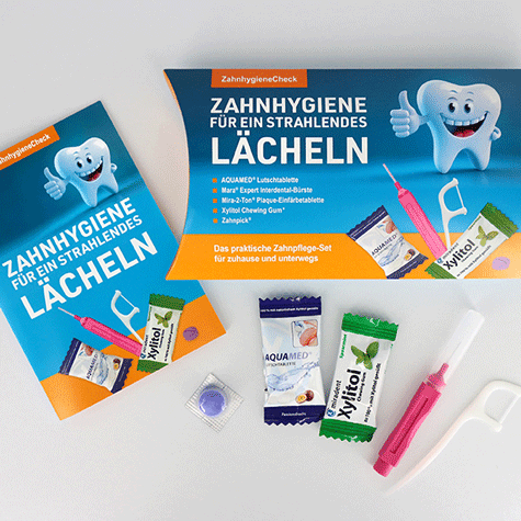 Der ZahnhygieneCheck bestehend aus einer individuell bedruckten Kissenverpackung und Ihrem Wunschinhalt. Er soll Menschen bei der Zahnpflege helfen und weiter dafür sensibilisieren, denn Zahngesundheit ist für jede Zielgruppe wichtig und muss immer wieder in Erinnerung gerufen werden. Mit den einzelnen Komponenten kann der aktuelle Hygienezustand der Zähne gecheckt (Färbetablette) und danach in mehreren Durchgängen gereinigt werden.