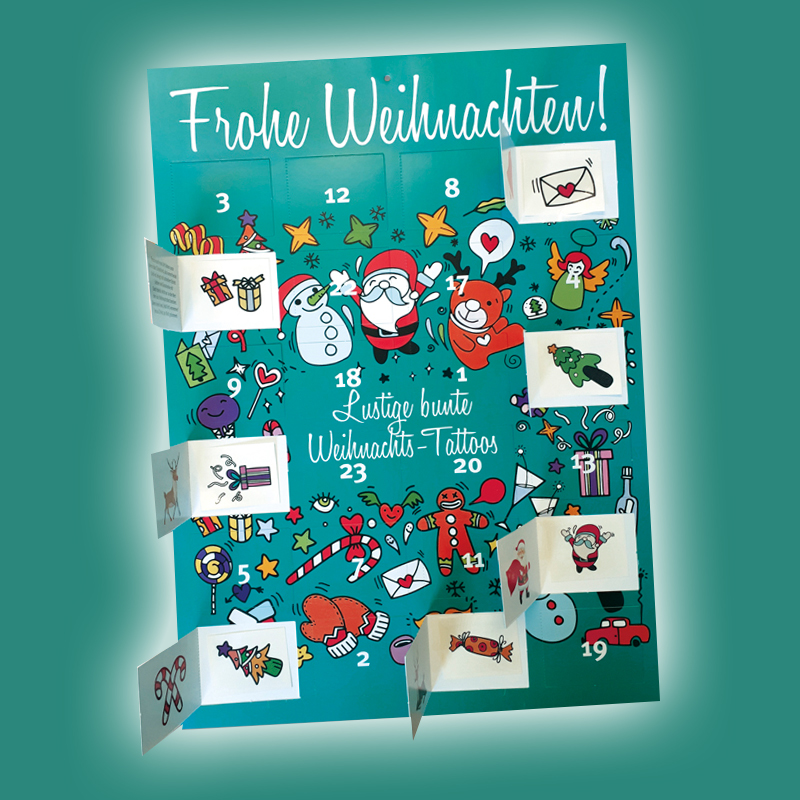 Inklusive vierfarbige Bedruckung des Deckblatts, der Rückseite, der Innentürchen, der Fläche auf die die Tattoos aufgeklebt sind (wird nach Abziehen der Tattoos sichtbar) und natürlich die 24 Tattoos im 4/1-c Offsetdruck.